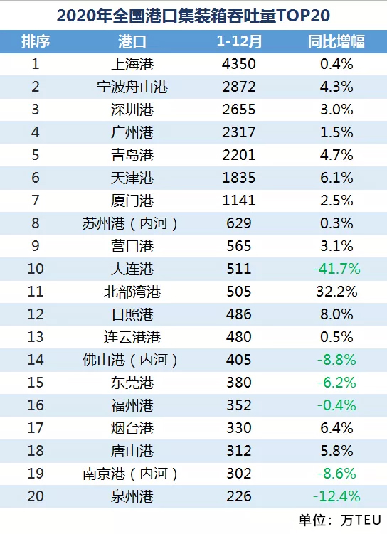 近日,2020年度的全國港口集裝箱吞吐量排行榜出爐,如下圖所示: