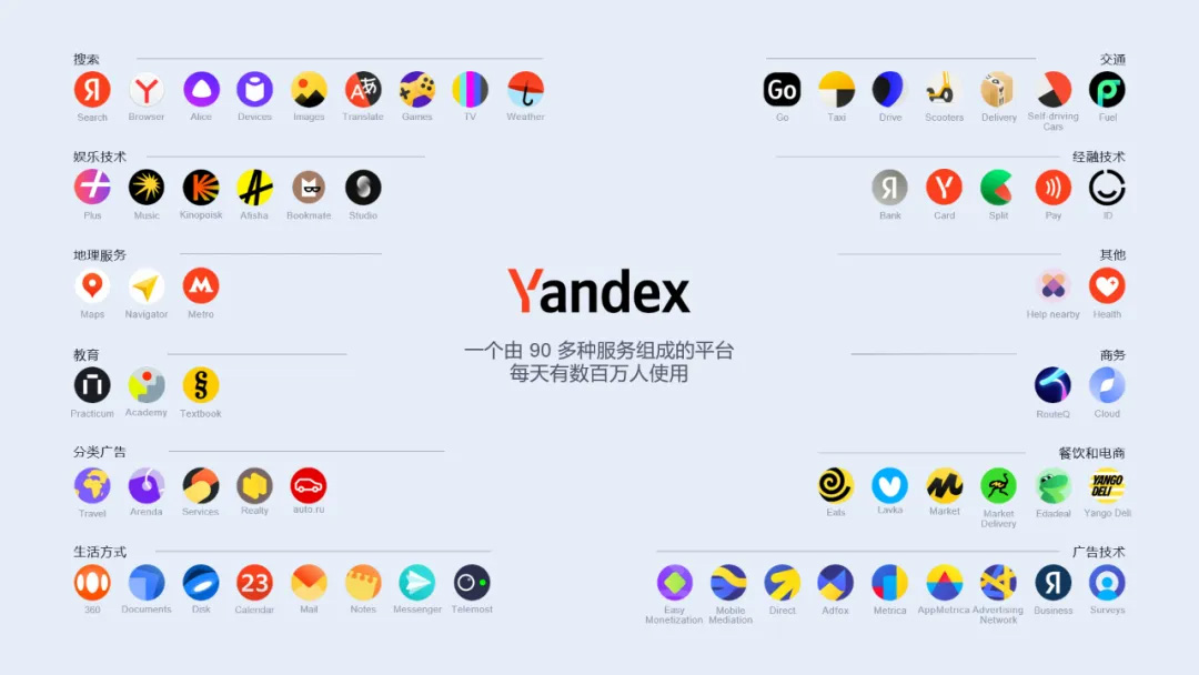 Yandex作為俄語(yǔ)市場(chǎng)的門(mén)戶,每天獨(dú)立訪問(wèn)者超過(guò)5040萬(wàn)人,其廣告服務(wù)每天被超過(guò)1500萬(wàn)人使用。同時(shí),它也是俄羅斯本土的搜索引擎,對(duì)于當(dāng)?shù)赜脩魜?lái)說(shuō),它不僅是搜索引擎,還提供多種服務(wù),如打車(chē)APP、地圖服務(wù)、電商平臺(tái)、外賣(mài)服務(wù)、視頻軟件和郵箱等,形成了豐富的產(chǎn)品生態(tài)鏈。