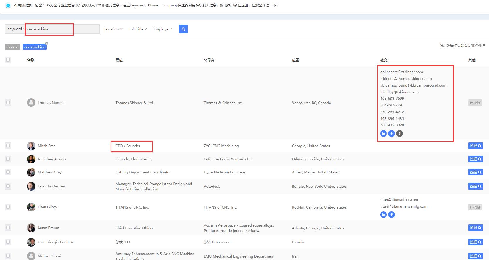 如上圖,海量的線上數(shù)據(jù),客戶只需要輸入關(guān)鍵詞點(diǎn)擊搜索即可獲取目標(biāo)客戶及公司職員的郵箱、電話、社交等有效信息。
