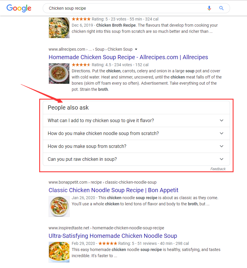 例如,如果有人搜索 [雞湯配方] ,你可以假設(shè)他想知道如何做雞湯。但其實(shí)他想知道的更多。滾動(dòng)到搜索引擎結(jié)果頁(yè)面的中間,你會(huì)發(fā)現(xiàn)谷歌的“People Also Ask”框,其中列出了一些與原始搜索字詞有關(guān)的問(wèn)題。