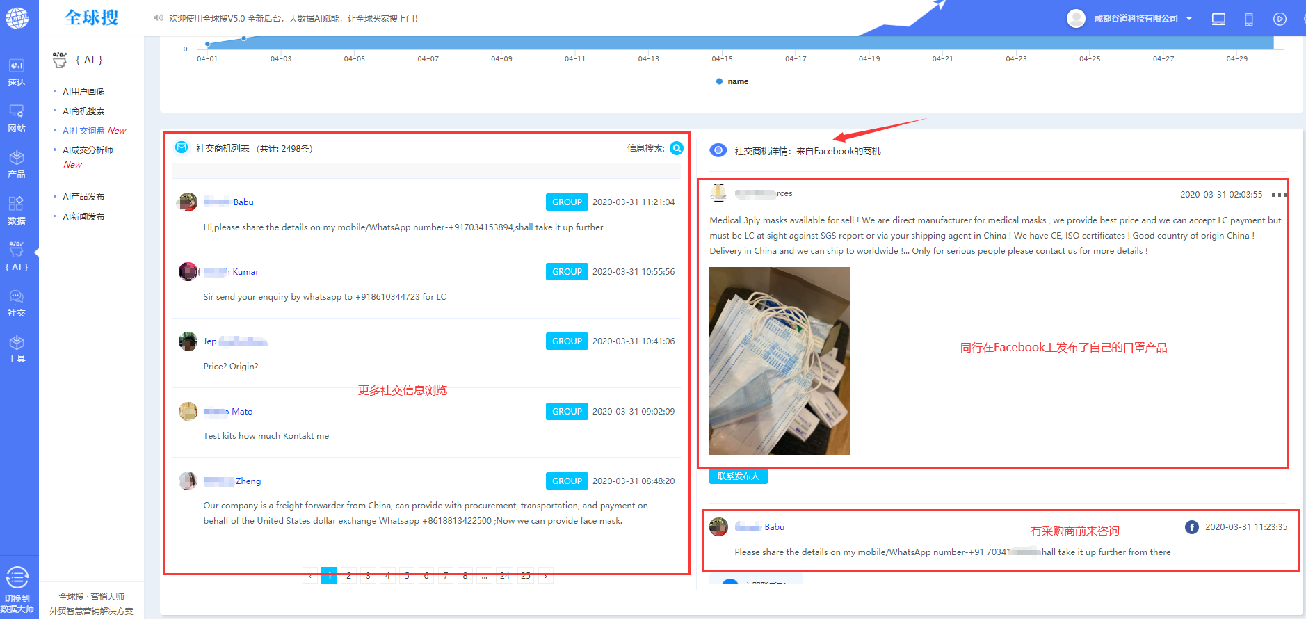 整合了各大社交平臺(tái)的信息,只要你輸入關(guān)鍵詞,就可以查詢到與該關(guān)鍵詞相關(guān)的所有社交詢盤(pán)(包括評(píng)論,帖子),讓你在第一時(shí)間,與意愿采購(gòu)者取得聯(lián)系。