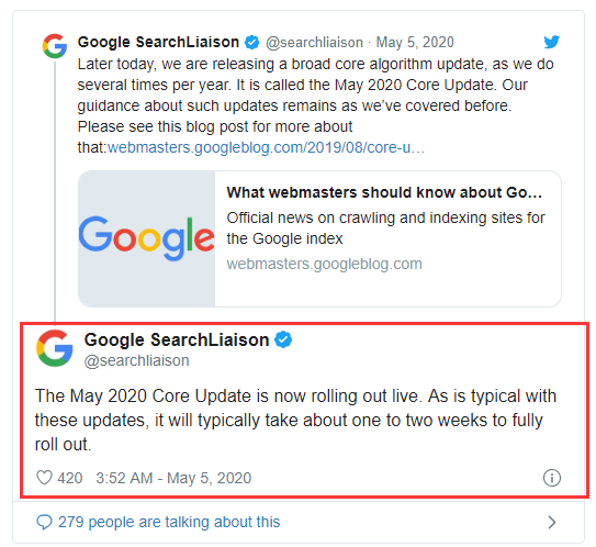 谷歌的官方發(fā)言人,丹尼·沙利文(Danny Sullivan)5月4日在Twitter上明確表示:谷歌在5月4日正式啟動了這次的算法更新。并命名為:2020年5月核心更新。