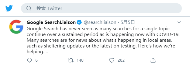 谷歌也表示:谷歌搜索從未見過像COVID-19這樣,對單個主題的搜索持續(xù)時間如此之長。許多搜索都是有關本地正在發(fā)生的新聞,比如最新的消息和最新的測試結(jié)果等。也就是說,疫情已經(jīng)改變了人們的搜索習慣以及需求。