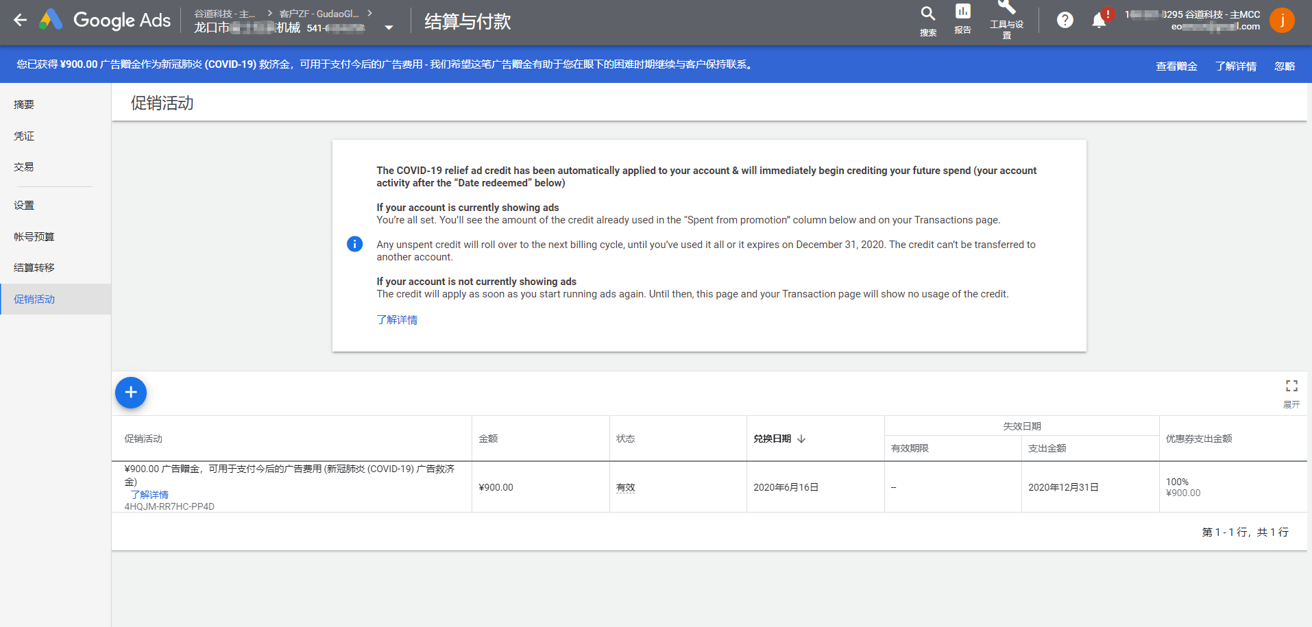 這是為了減緩此次疫情對(duì)廣大企業(yè)的經(jīng)濟(jì)影響,廣告贈(zèng)金會(huì)自動(dòng)下發(fā)于Google廣告帳戶中的“促銷”標(biāo)簽,有效期至2020年12月31日。