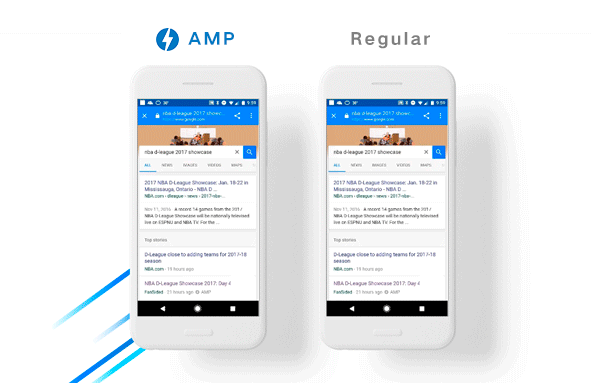 上圖為某網(wǎng)站加了AMP項目后,在移動設(shè)備端的評分,以及在移動手機端的展示情況。我們可以發(fā)現(xiàn),網(wǎng)站評分相當不錯,且在移動端有專門的閃電符號專屬標識。