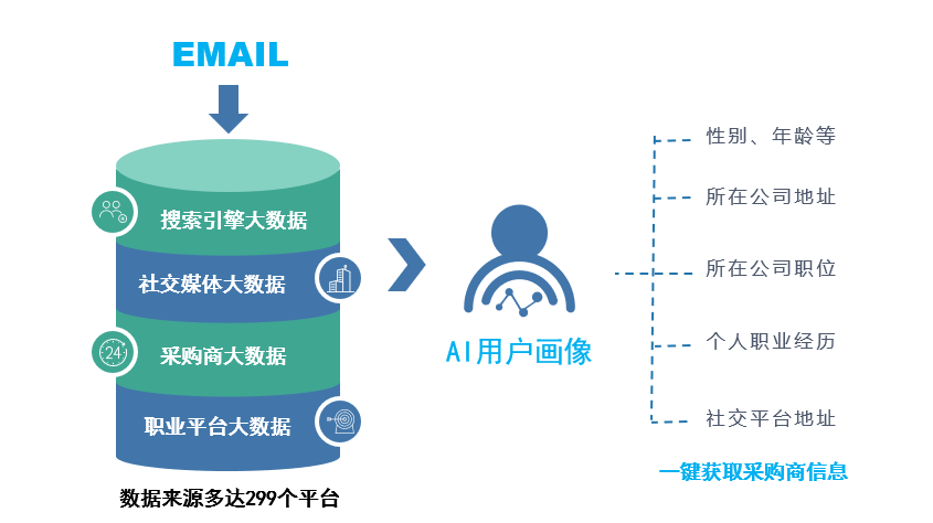 AI用戶畫像功能,通過一個(gè)Email,就可以查詢到這個(gè)“采購(gòu)商”的性別、年齡、公司職位、職業(yè)經(jīng)歷、教育經(jīng)歷、社交主頁(yè)等信息,讓主動(dòng)開發(fā)更有保證!