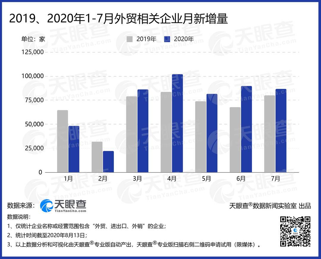據(jù)天眼查數(shù)據(jù),以工商登記為準,截至8月13日,我國今年1-7月共新增近52萬家外貿(mào)相關(guān)企業(yè),較去年同比增長7%。2017年起,連續(xù)三年新增80萬余家外貿(mào)相關(guān)企業(yè)。